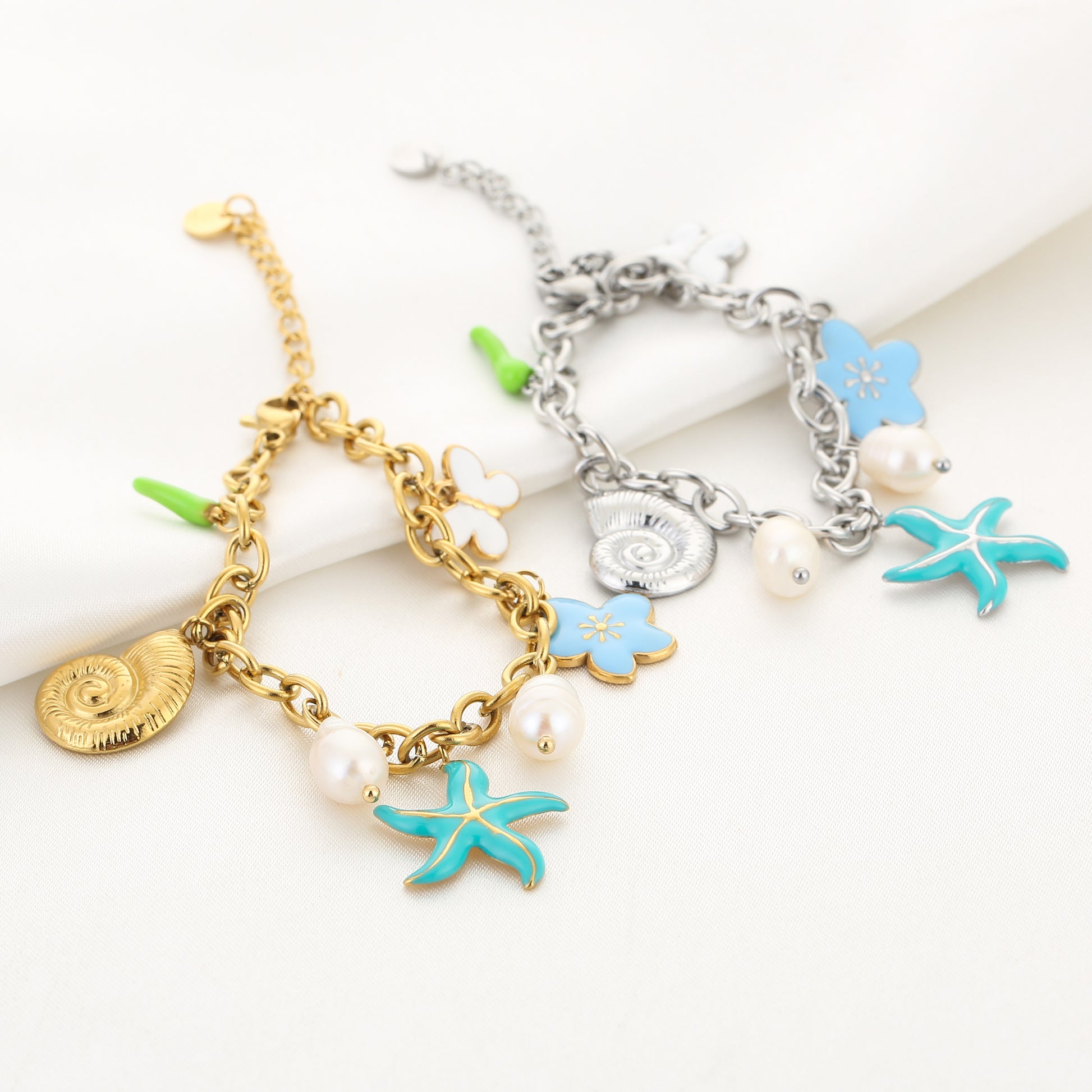 Stap in een zomerse dagdroom met deze betoverende armband, versierd met speelse en betekenisvolle bedels: een groene zeester (vernieuwing & rust), een blauwe bloem (groei & intuïtie), parels ( zachtheid & elegantie) en een witte vlinder (vrijheid & Transformatie). Deze armband vangt het gevoel van een zonnige dag aan zee, met een vrouwelijker en dromerige uitstraling die elke outfit bijzonder maakt. Een kleurrijk sieraad vol symboliek perfect om het strandgevoel elke dag mee te dragen.